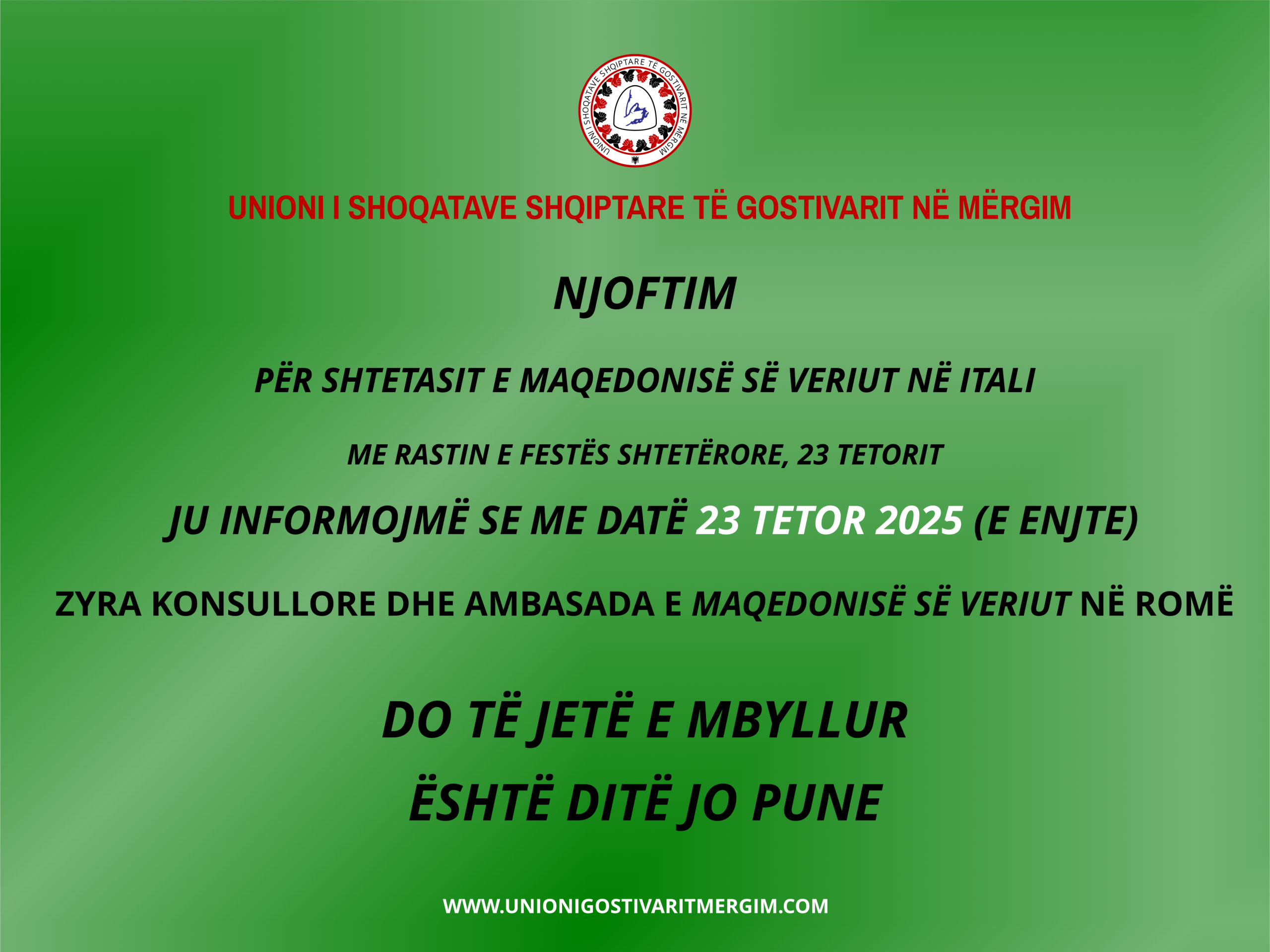 Deprecated: Creation of dynamic property PageLayer::$from_header_to_footer is deprecated in /home/unionigo/public_html/wp-content/plugins/pagelayer/main/template.php on line 1048 NJOFTIM: Me datë 23 Tetor 2025, Ambasada e Maqedonisë së Veriut në Romë të Italisë, do të jetë e mbyllur – Unioni i Shoqatave Shqiptare të Gostivarit në Mërgim