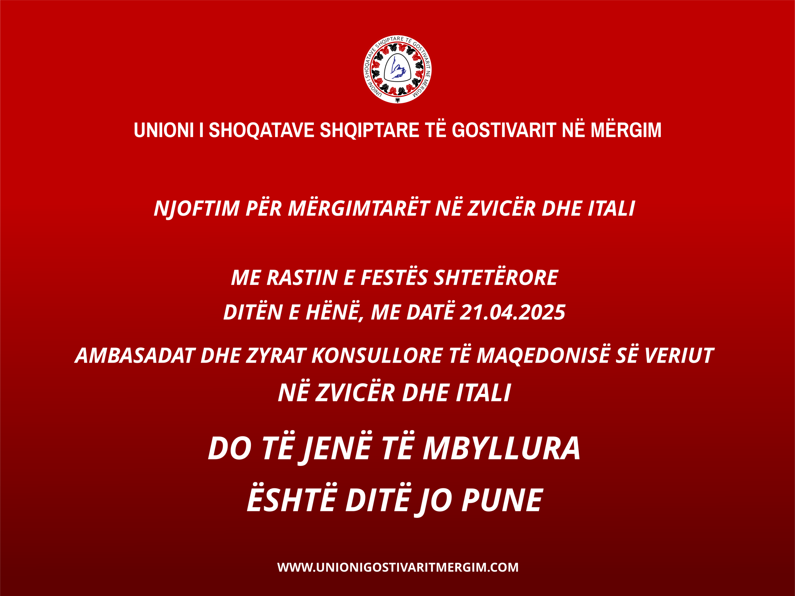 | Njoftim për mërgimtarët në Zvicër dhe Itali Me rastin e festës shtetërore, ditën e hënë, me datë 21.04.2025, ambasadat dhe zyrat konsullore të Maqedonisë së Veriut, në Zvicër dhe Itali, do të jenë të mbyllura, është ditë jo pune. www.unionigostivaritmergim.com |