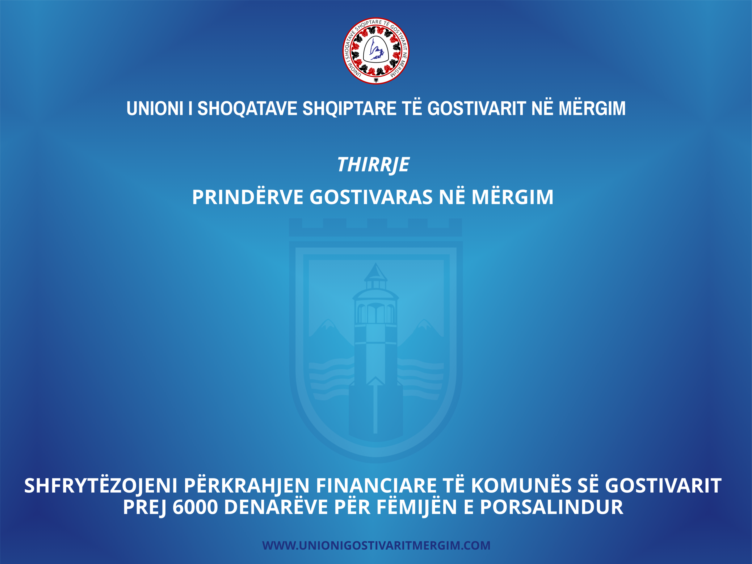 Unioni i Shoqatave Shqiptare të Gostivarit në Mërgim, i njofton të gjithë familjet gostivarase që përkohësisht punojnë dhe jetojnë jashtë Gostivarit, në Mërgim, sidomos prindërit e fëmijëve të porsalindur nga 1 janari i 2025-ës, se kanë të drejt të barabartë si gjithë qytetarët, ta shfrytëzojnë të drejtën e njëhershme financiare prej 6000 denarëve për fëmijën e porsalindur, të cilën e ofron Komuna e Gostivarit.