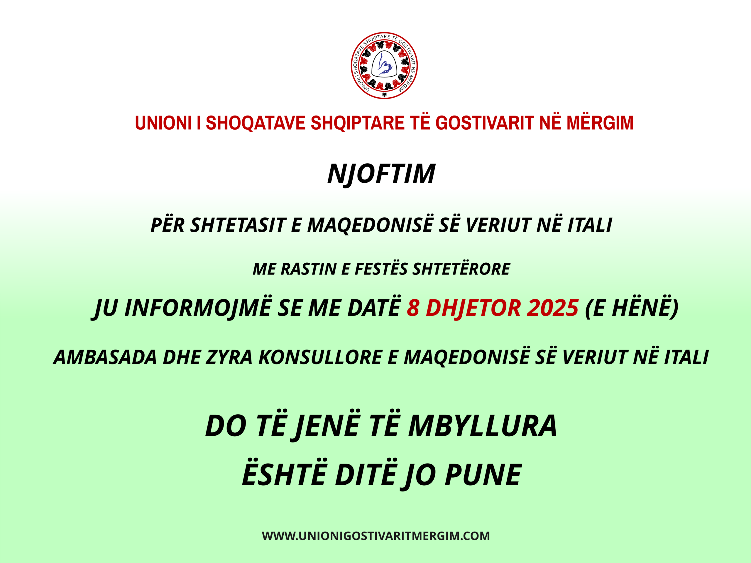 NJOFTIM: Me datë 8 Dhjetor 2025, Ambasada e Maqedonisë së Veriut në Itali, do të jetë e mbyllur