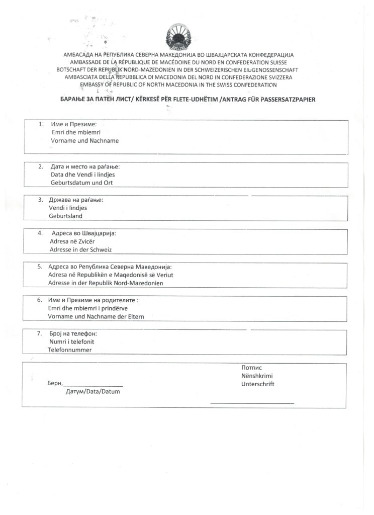 E nëse vlefshmëria e pasaportës suaj ka skaduar, atëherë kontaktoni me ambasadën në Bern dhe pajisuni me Flet Udhëtim/e.