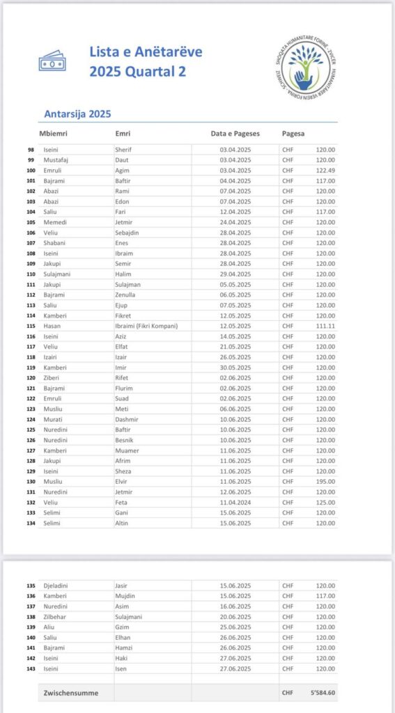 Të nderuar anëtar lista e anëtarsis kuartali Q2 prej 01.04.2025 deri 30.06.2025.