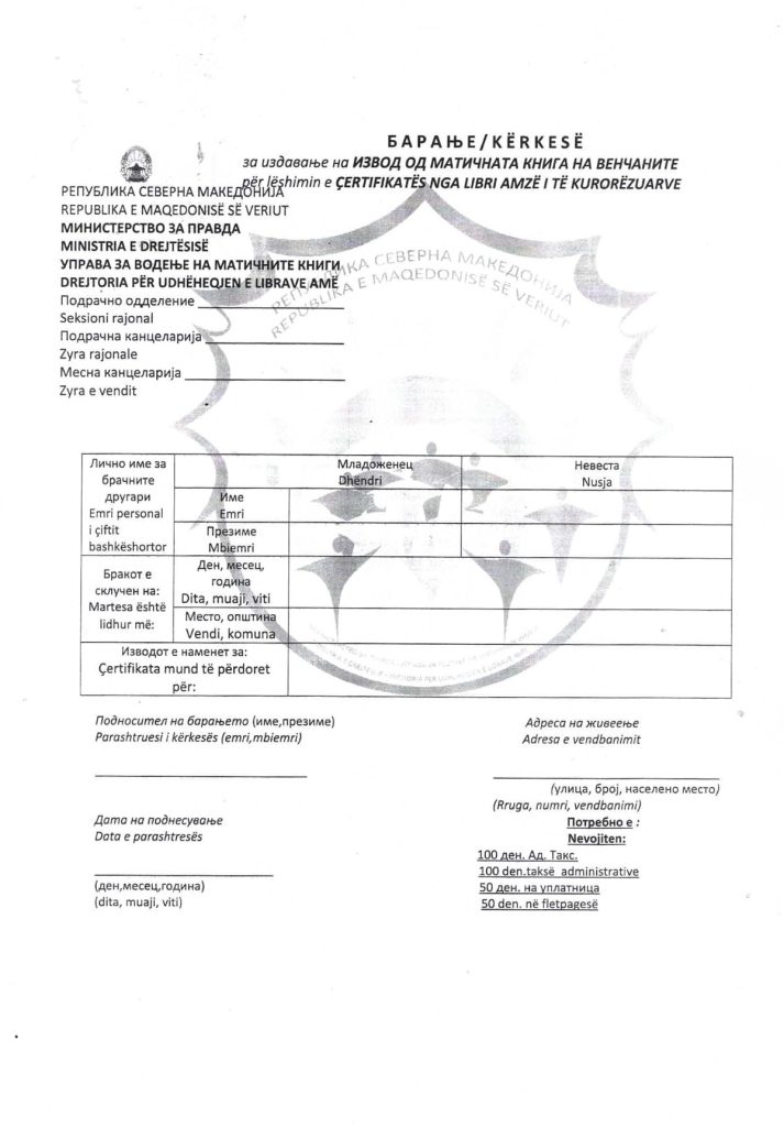 • Plotësoni kërkesën për lëshimin e certifikatës nga libri amzë i të kurorëzuarve