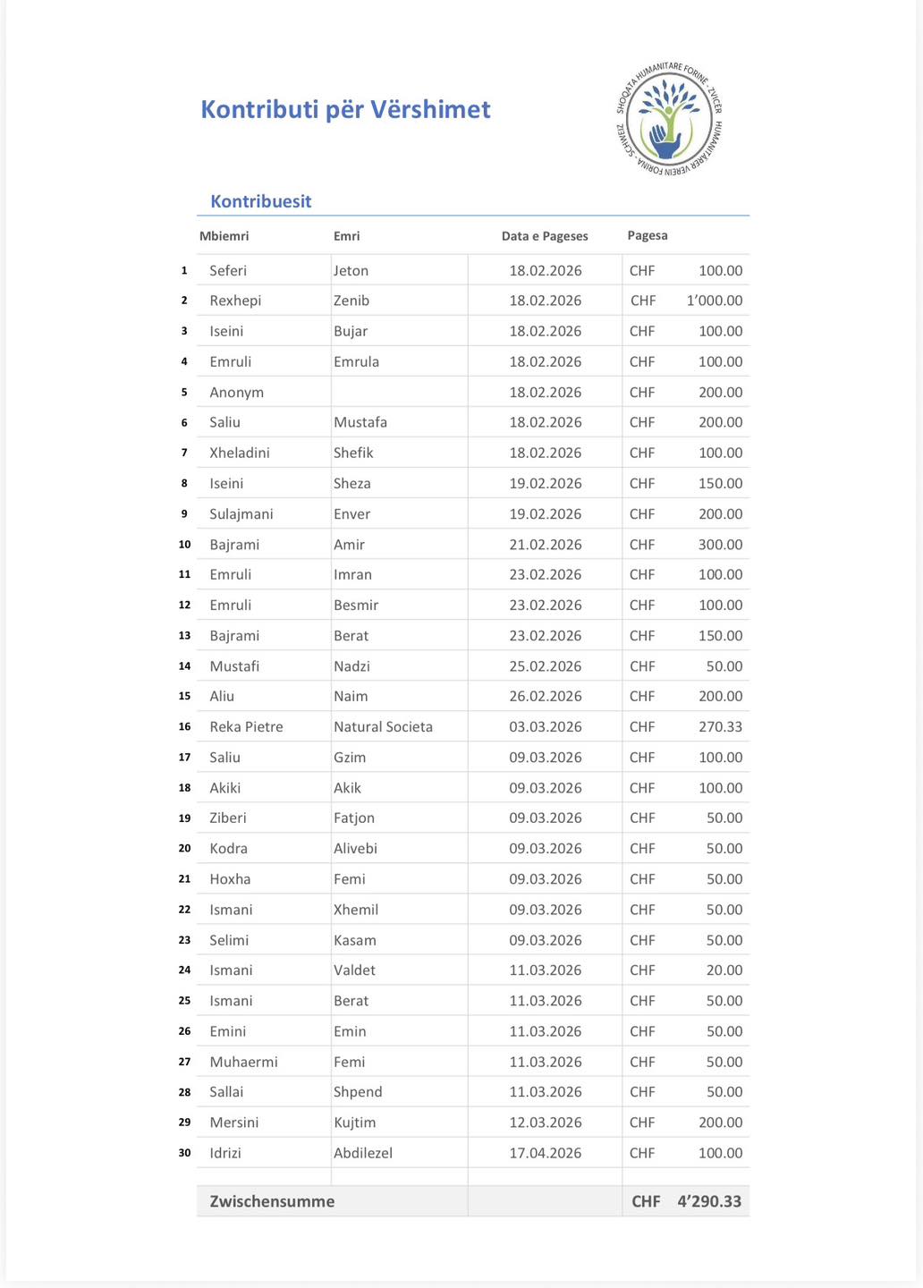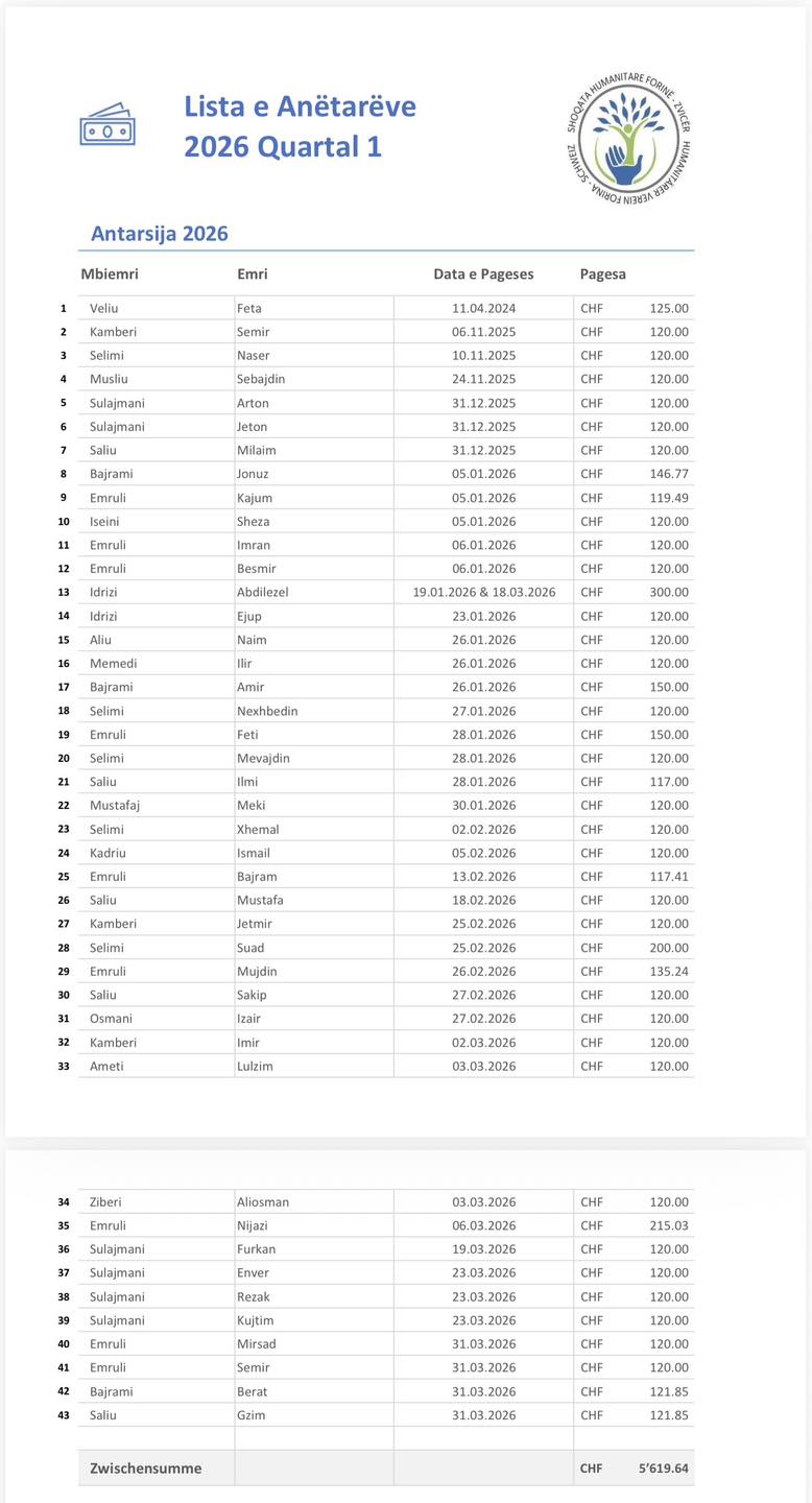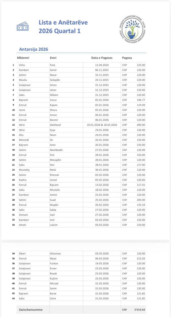 Të nderuar anëtar lista e anëtarsis kuartali Q1 prej 01.01.2026 deri 31.03.2026.